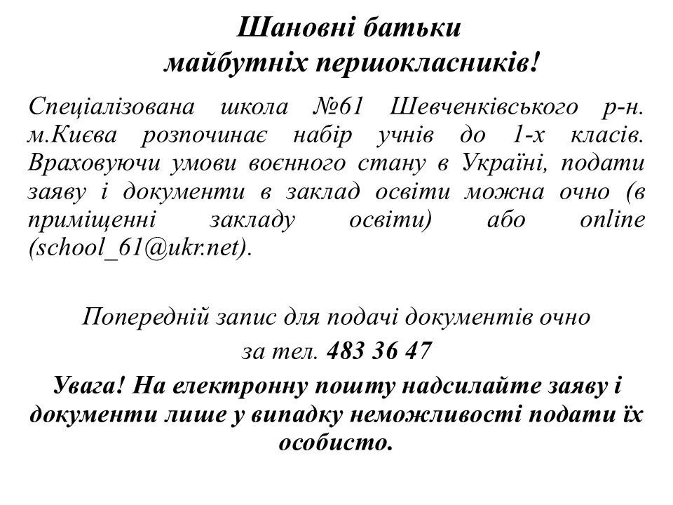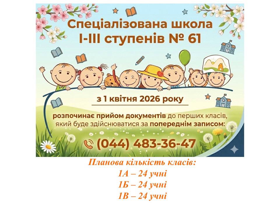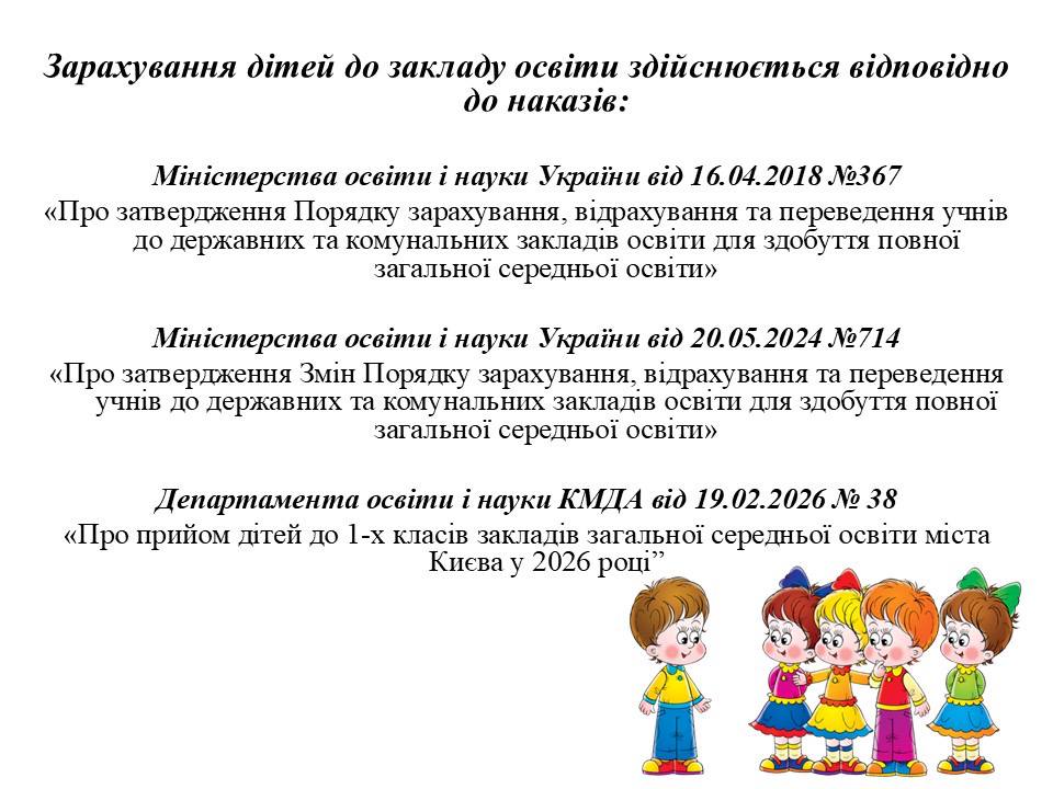 УВАГА! Електронний запис дітей на Порталі послуг. https://portal.kyiv.digital/service/first-school Наказ Департамента освіти і науки КМДА від 27.02.2026 № 30 “Про прийом дітей до перших класів закладів загальної середньої освіти комунальної власності територіальної громади міста Києва у 2026 році” Про закріплення за закладами дошкільної та середньої освіти Шевченківського району міста Києва територій обслуговування у 2026-2027 навчальному році Про закріплення за закладами дошкільної та середньої освіти Шевченківського району міста Києва територій обслуговування у 2026-2027 навчальному році “Як перевірити готовність дитини до школи: практичні поради психолога”